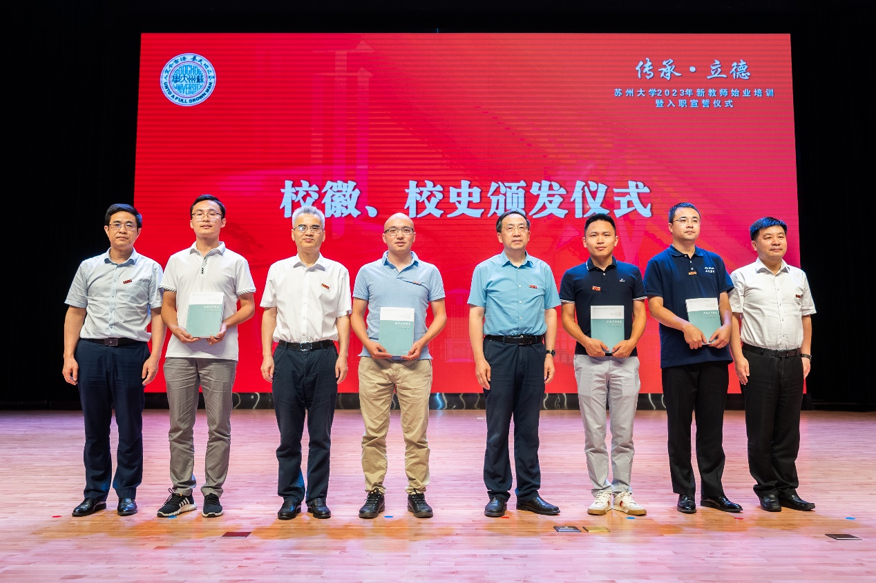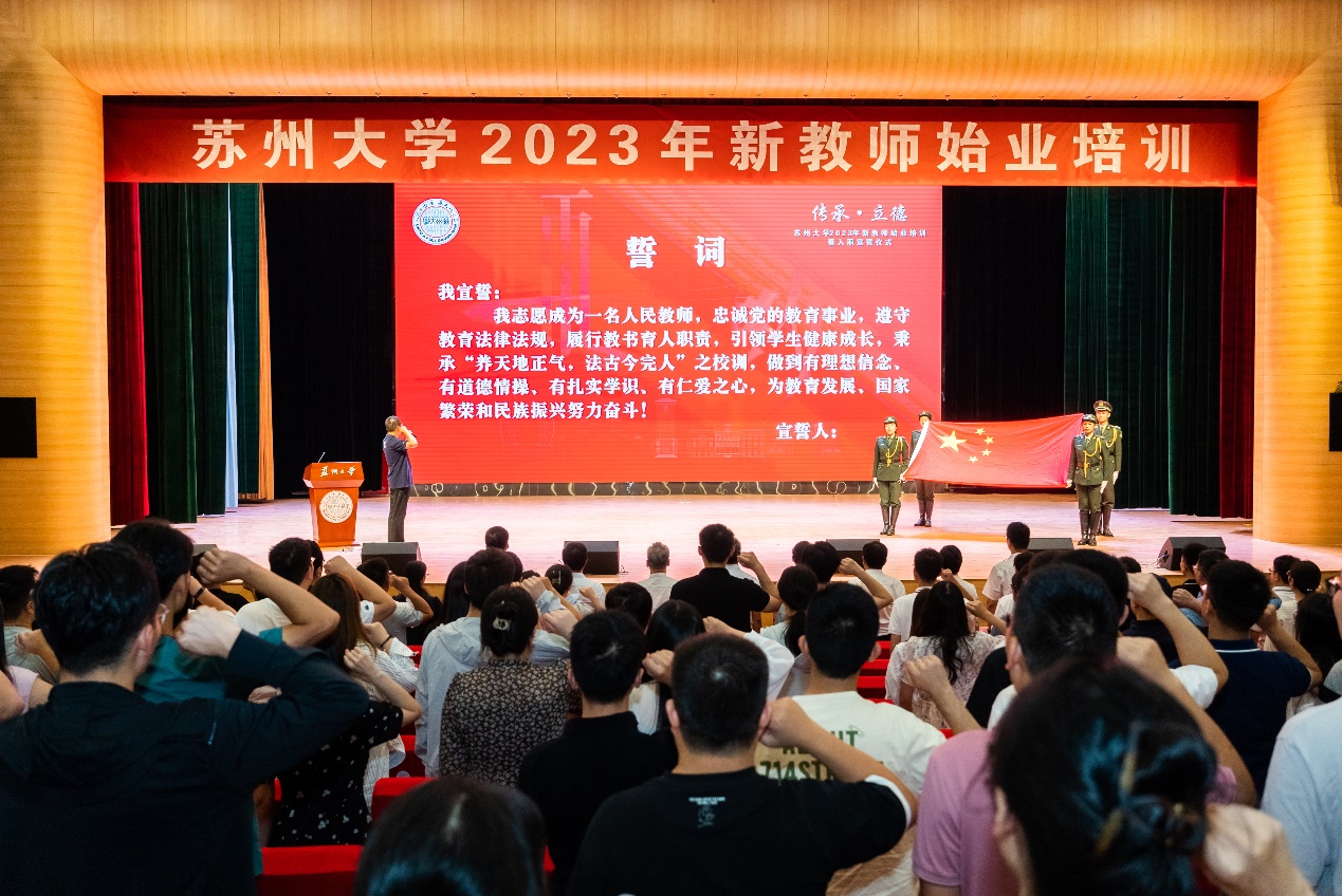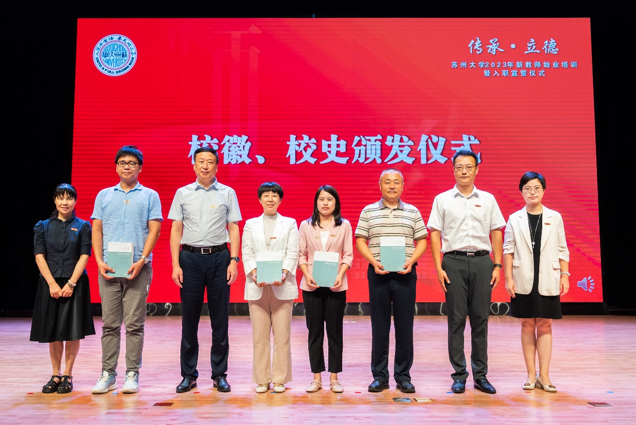 入职仪式上,学校相关职能部门领导向新教师代表赠予《苏州大学校史》、颁发苏州大学校徽,象征着“养天地正气,法古今完人”校训精神的传承和发扬。全体新教师面向国旗作出庄严承诺,铮铮誓言响彻会场,句句铿锵入耳入心。