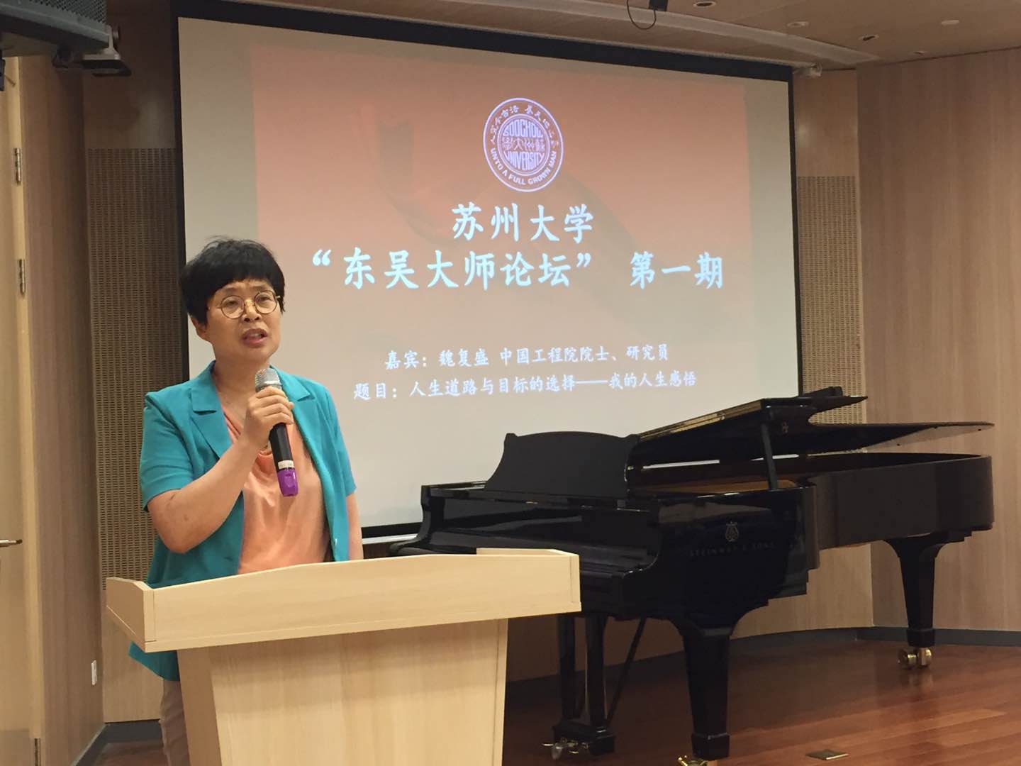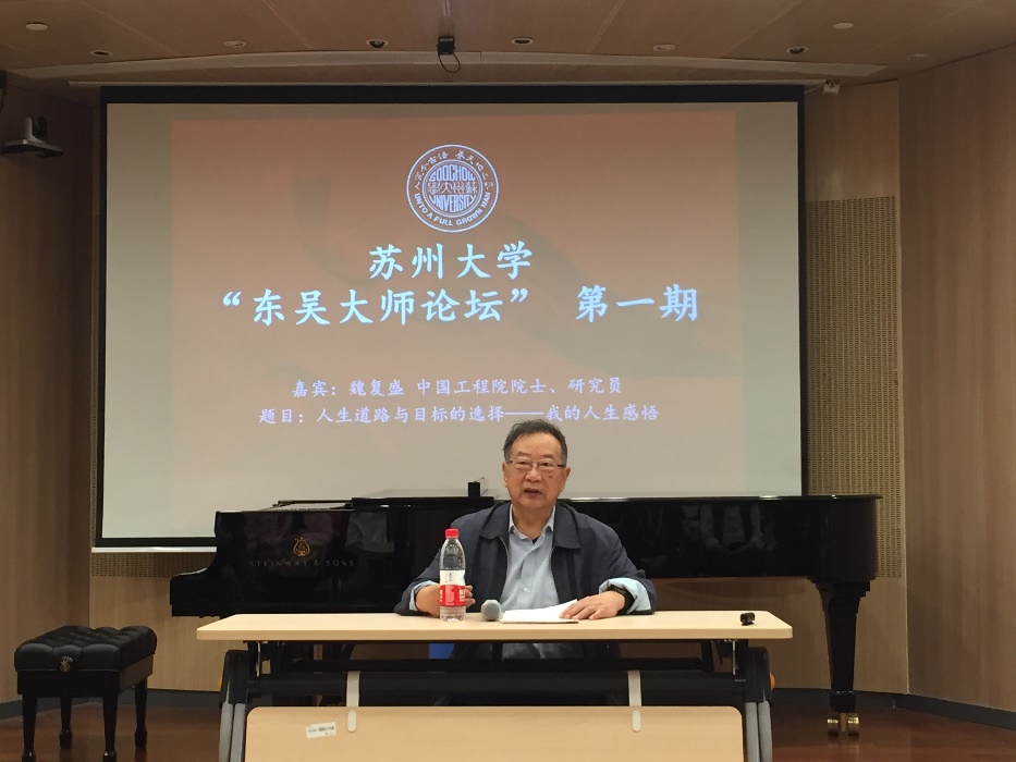 5月23日上午,苏州大学首期“东吴大师讲坛”在独墅湖校区恩玲艺术中心二楼报告厅举行,中国工程院院士魏复盛做客讲坛,为师生带来题为“人生道路与目标的选择——我的人生感悟”的精彩报告。党委副书记、副校长路建美,党委教师工作部部长何峰、科学技术研究部综合办主任刘海燕、材料与化学化工学部书记李翔、纳米科学技术学院副书记洪晔等出席活动。