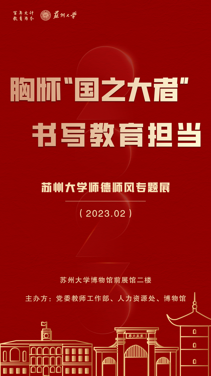 “胸怀‘国之大者’,书写教育担当——苏州大学师德师风专题展”今日起在博物馆前展馆2楼开展。