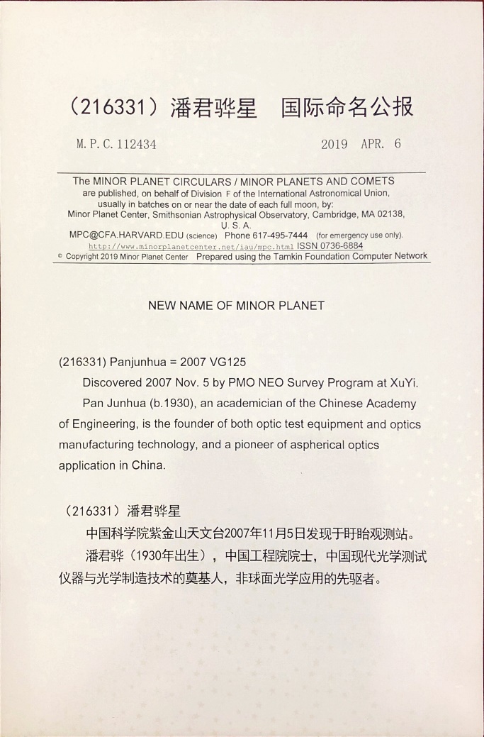 近日,苏州大学收到中科院紫金山天文台小行星命名委员会发来的贺电,祝贺国际编号为216331号小行星被命名为“潘君骅星”。由于小行星命名的严肃性、唯一性和永久不可更改性,使得能够获得小行星命名成为世界公认的一项殊荣。这颗以潘君骅命名的小行星是为了表彰这位中国著名光学专家、中国工程院院士长期在应用光学研究领域做出的巨大贡献。